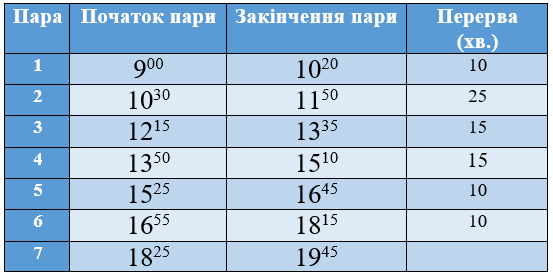 Встановити з 28 жовтня 2019 року до 30 березня 2020 року наступний розклад дзвінків